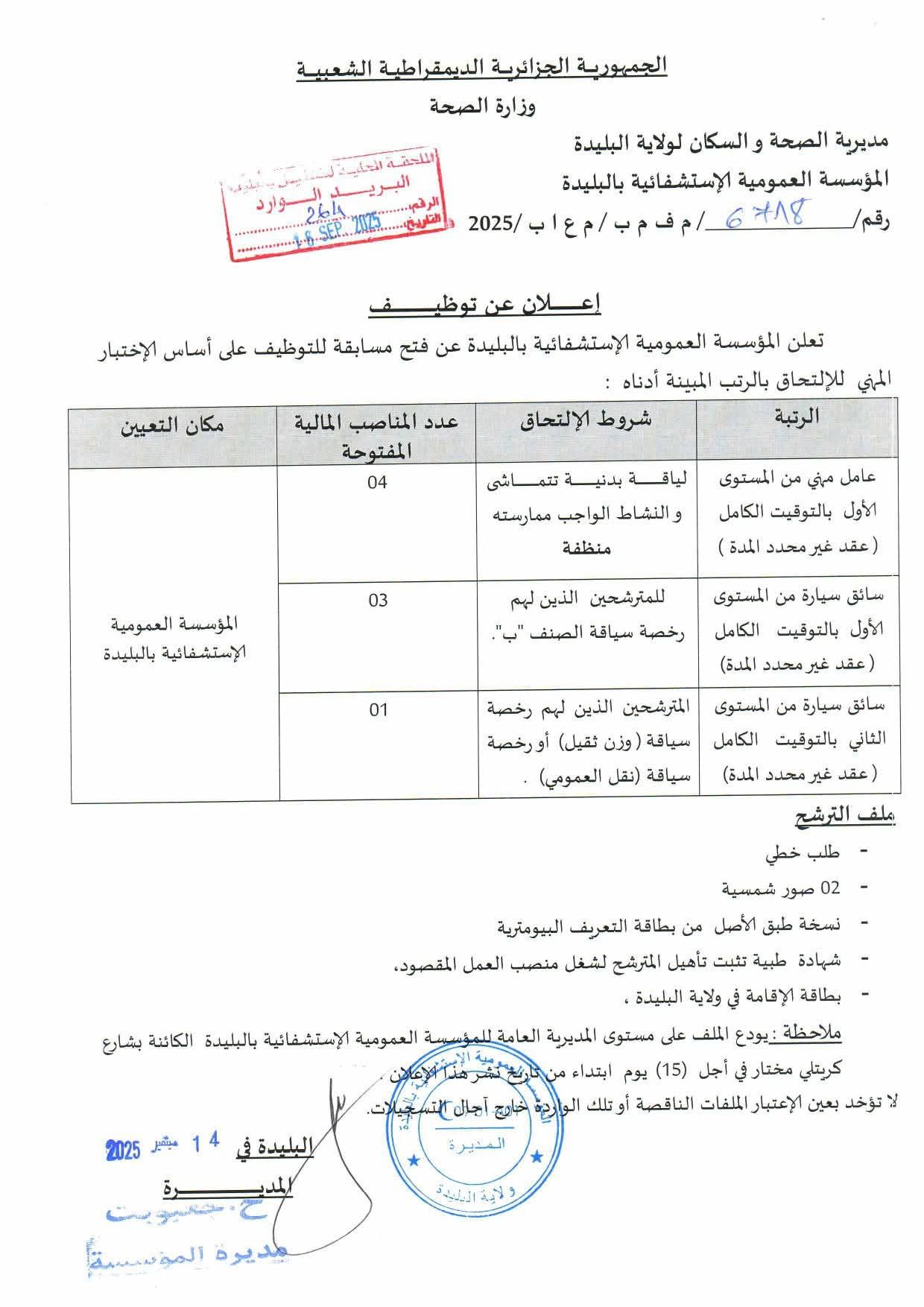 تعلن مؤسسات حكومية بولاية البليدة عن فتح عدة مناصب توضيف كما هو مبين في صور .