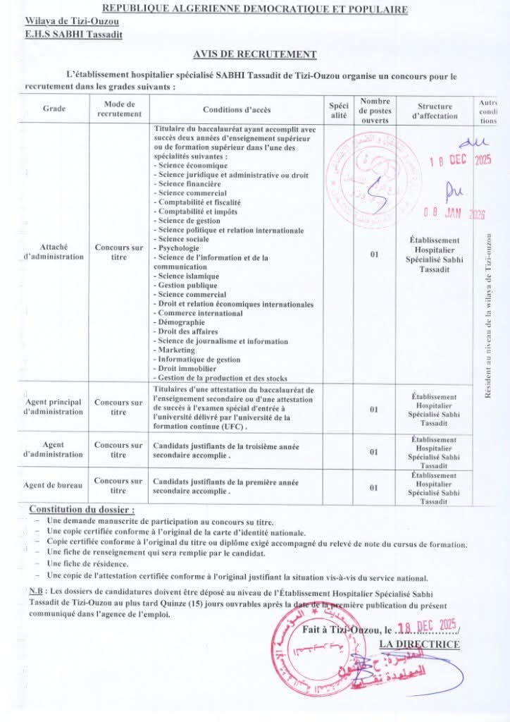 اعلان توظيف مؤسسة استشفائية تيزي وزو