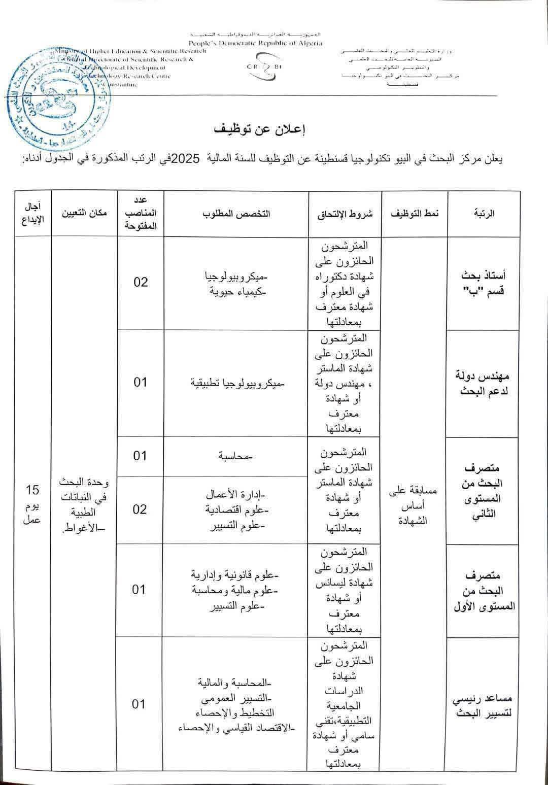 يعلن مركز البحث في البيوتكنولوجيا – قسنطينة عن تنظيم مسابقات توظيف على أساس الشهادات للسنة المالية 2025، في الرتب التالية: