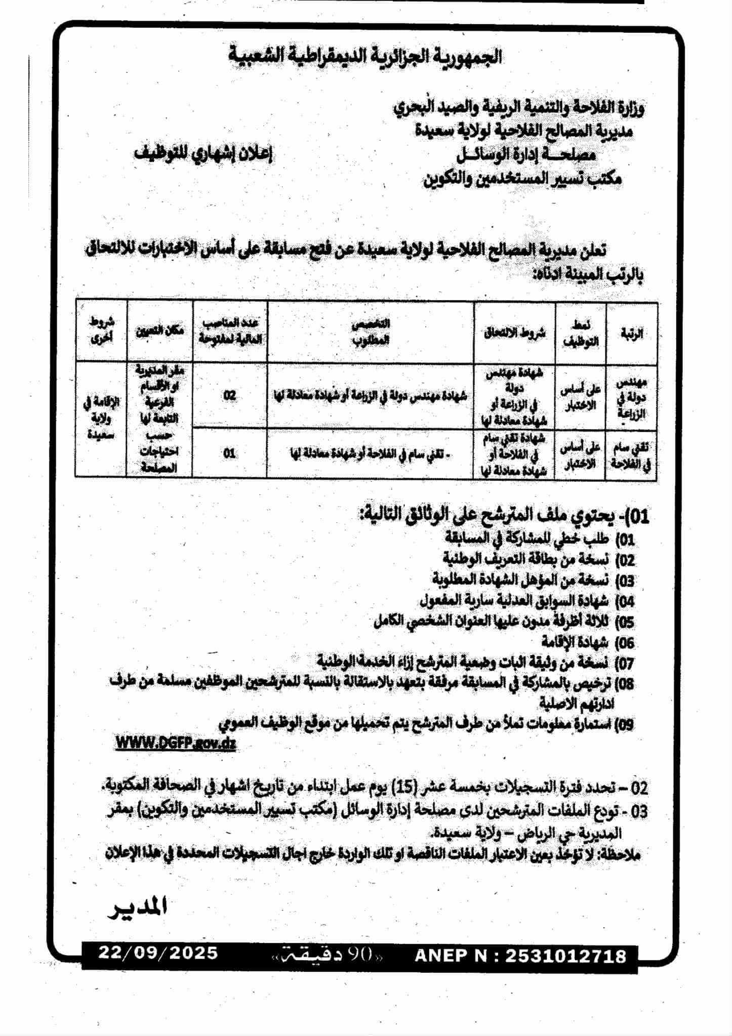 الشركة: التصنيف: القطاع الحكومي المنطقة: سعيدة نشرت في: 2025-09-28