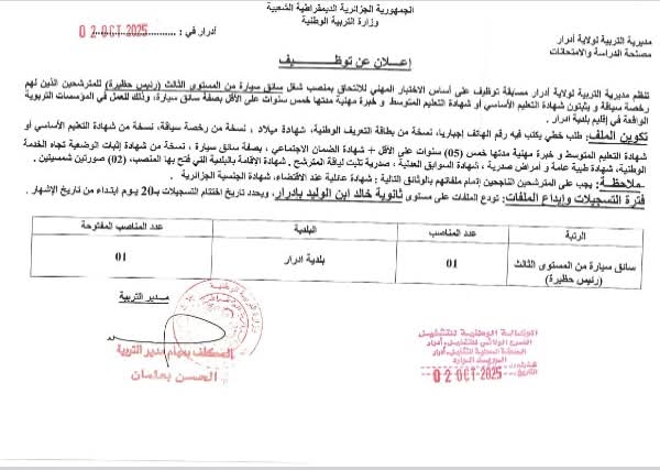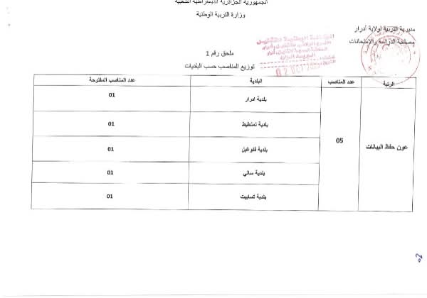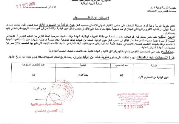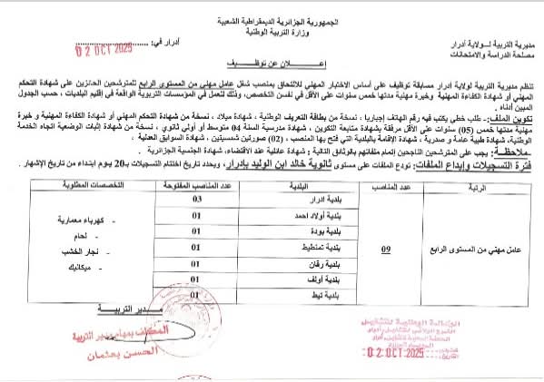 يُعلِم الفرع الولائي للتشغيل – أدرار كافة طالبي العمل أن قطاع التربية الوطنية قد فتح مناصب توظيف لفائدة عدد من المؤسسات التربوية عبر ولاية أدرار.