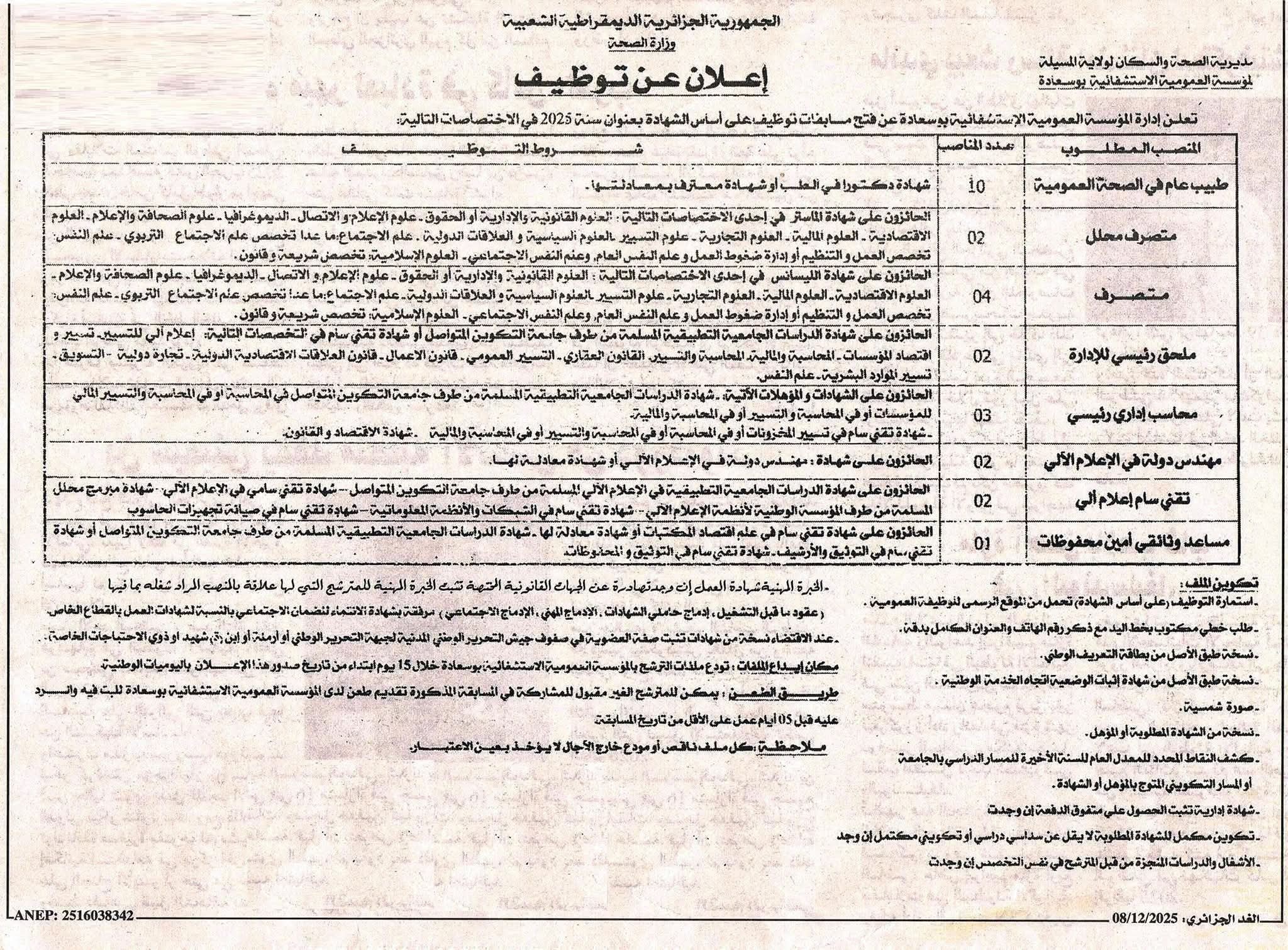 اعلان عن توظيف المؤسسة العمومية الاستشفائية بوسعادة