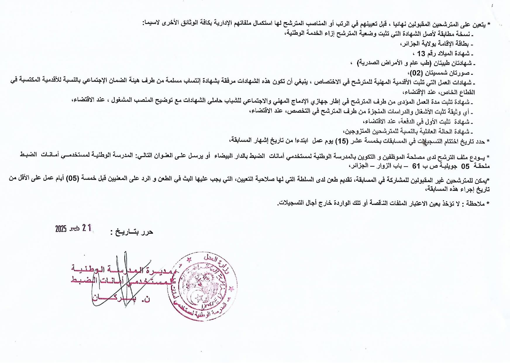 تعلـن المدرسة الوطنية لمستخدمي أمانات الضبط عن فتـح مسابقـة توظيف